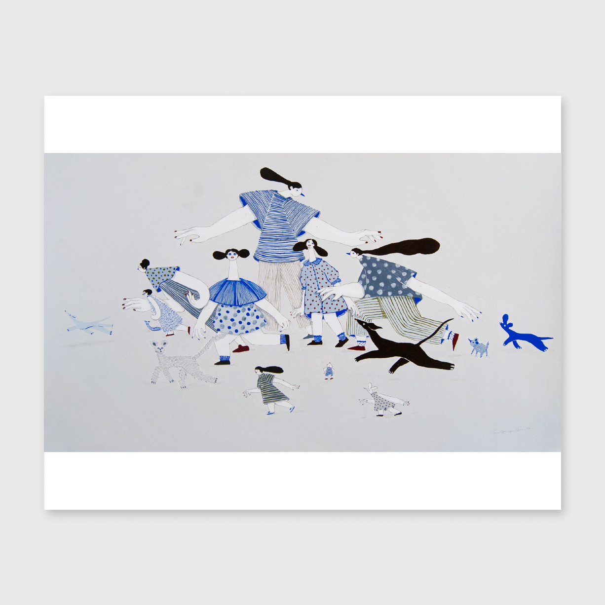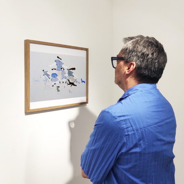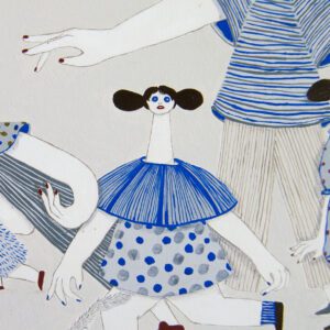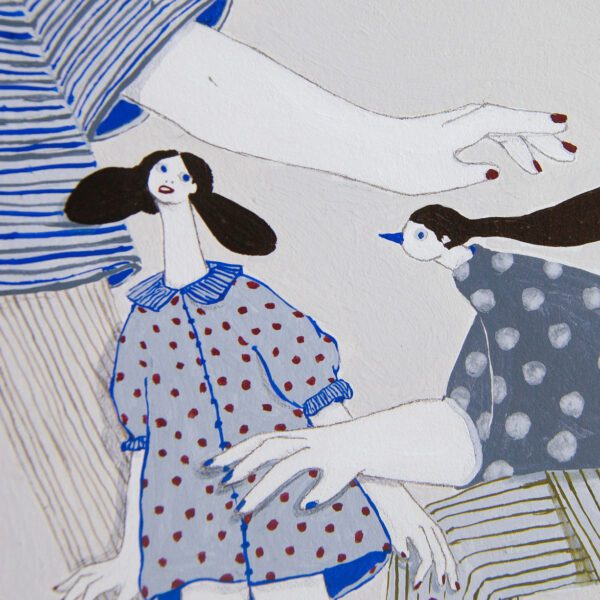 Constança works in different scales and techniques but has a soft spot for blues and grays and for dolls with big ears. Above all, she doesn’t know how to live without making up stories and she doesn’t show much interest in learning either.