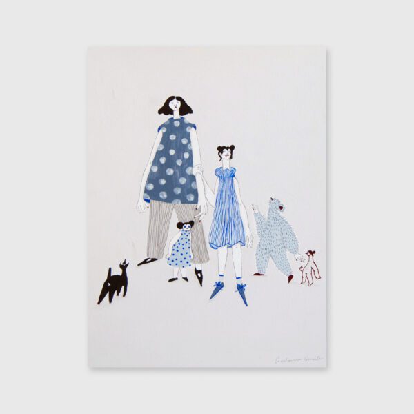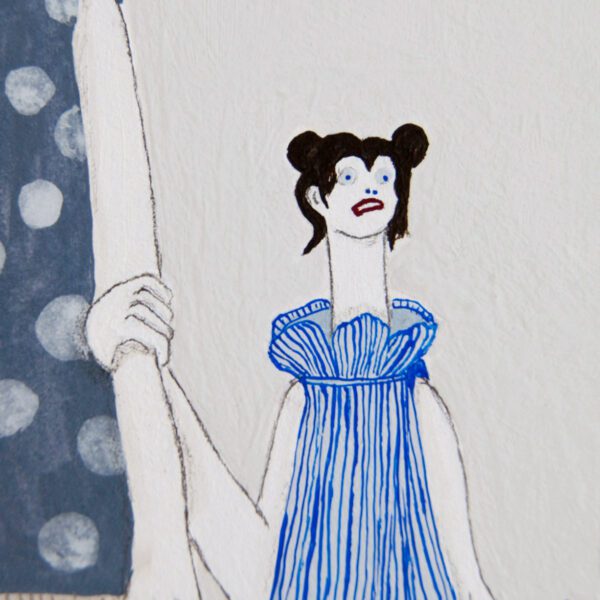 Constança works in different scales and techniques but has a soft spot for blues and grays and for dolls with big ears. Above all, she doesn’t know how to live without making up stories and she doesn’t show much interest in learning either.