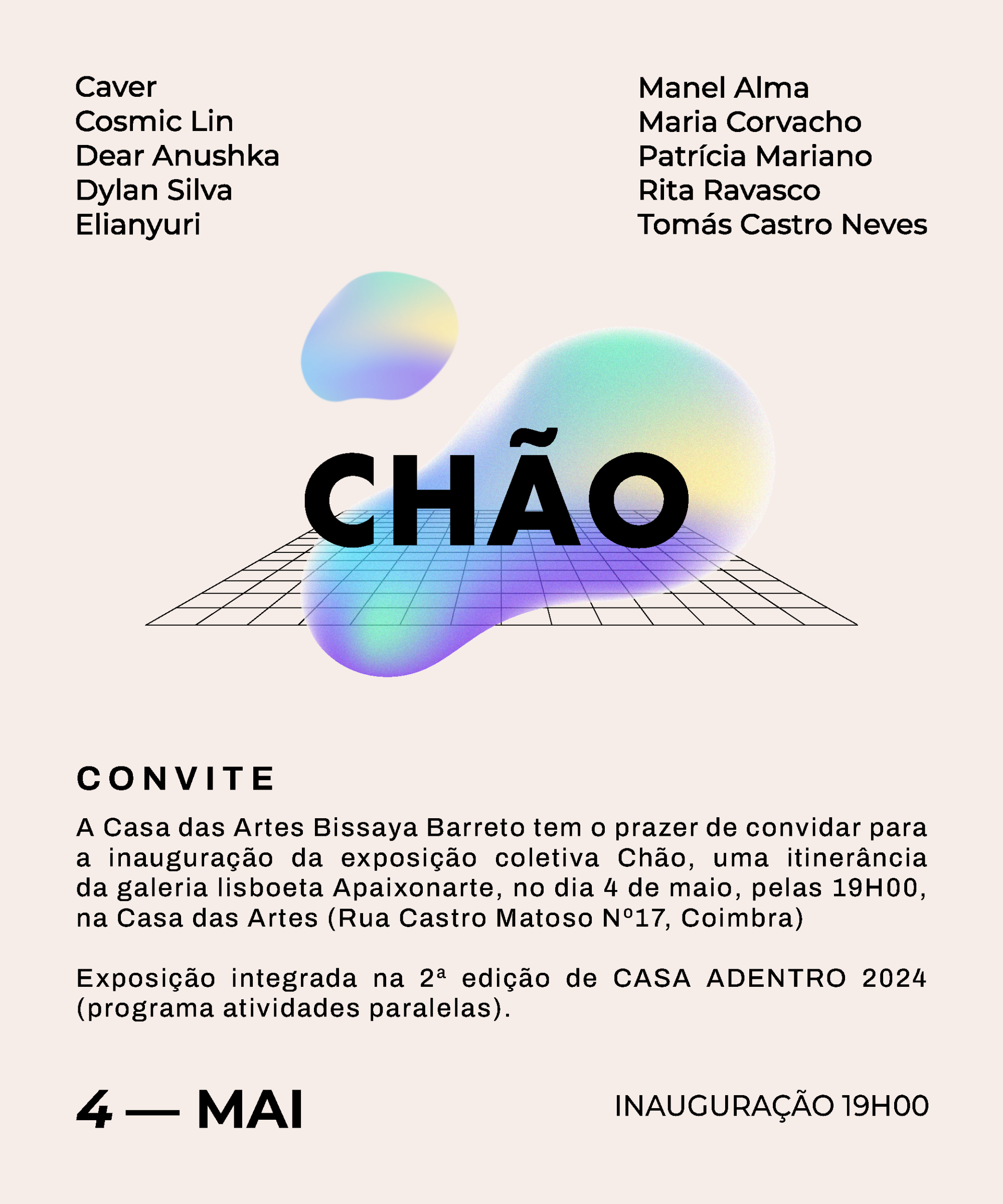 At the invitation of CASA ADENTRO, the group exhibition CHÃO will be part of the program for its 2nd edition and will be hosted by the Casa das Artes Bissaya Barreto.