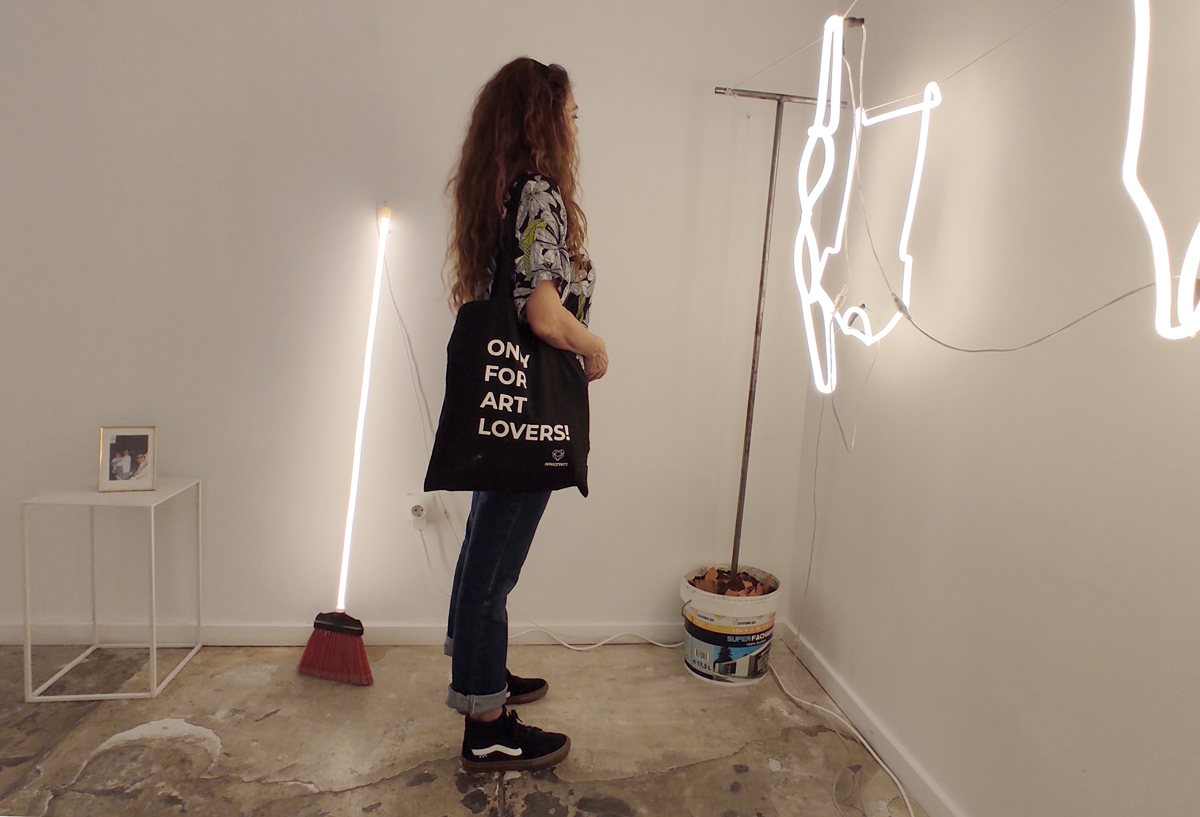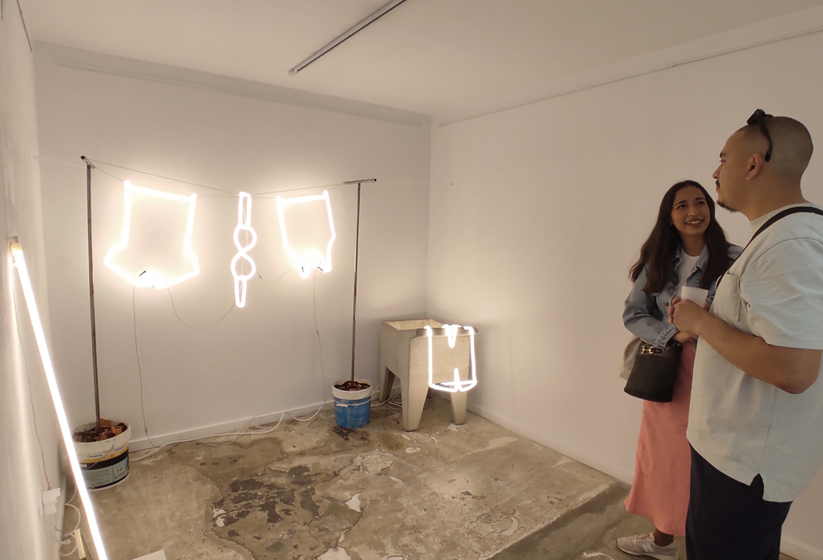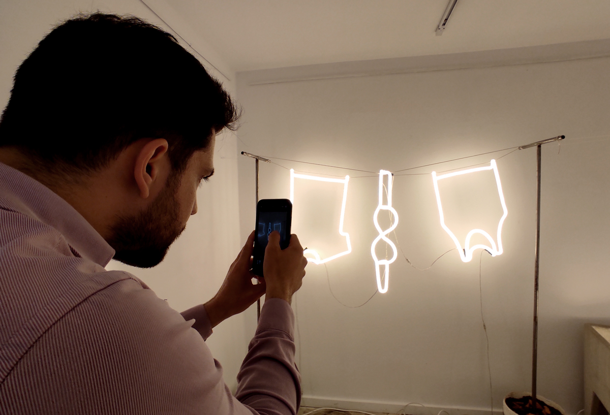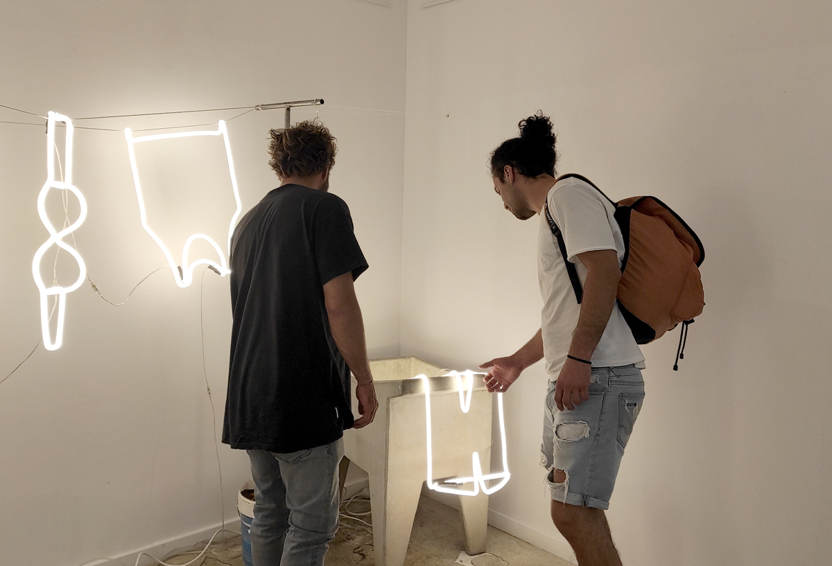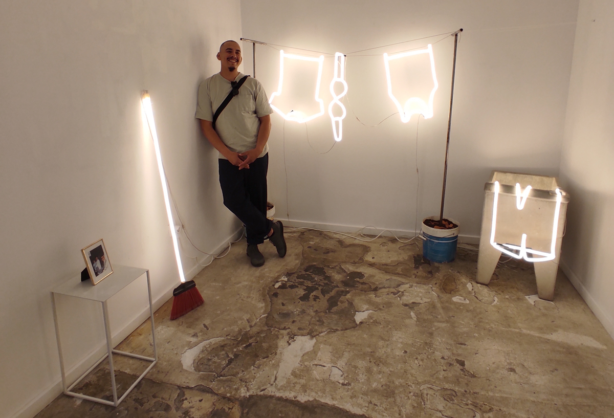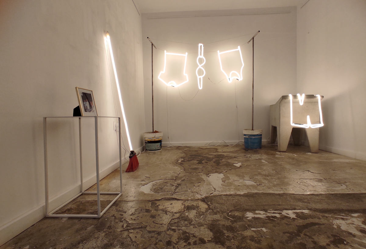 It is in this context that A PATRÔA E O TEMPO appears, through the invitation of Apaixonarte to Elianyuri, to focus his project, this time between four walls, where most of the domestic work takes place. Thus, a line of thought is extended, from the outside to the inside, which, in a scenic way, takes us back to the obscure essence of the matter that the artist approaches. Here, Elianyuri creates an installation of light contours of the objects most used in the daily life of the home.