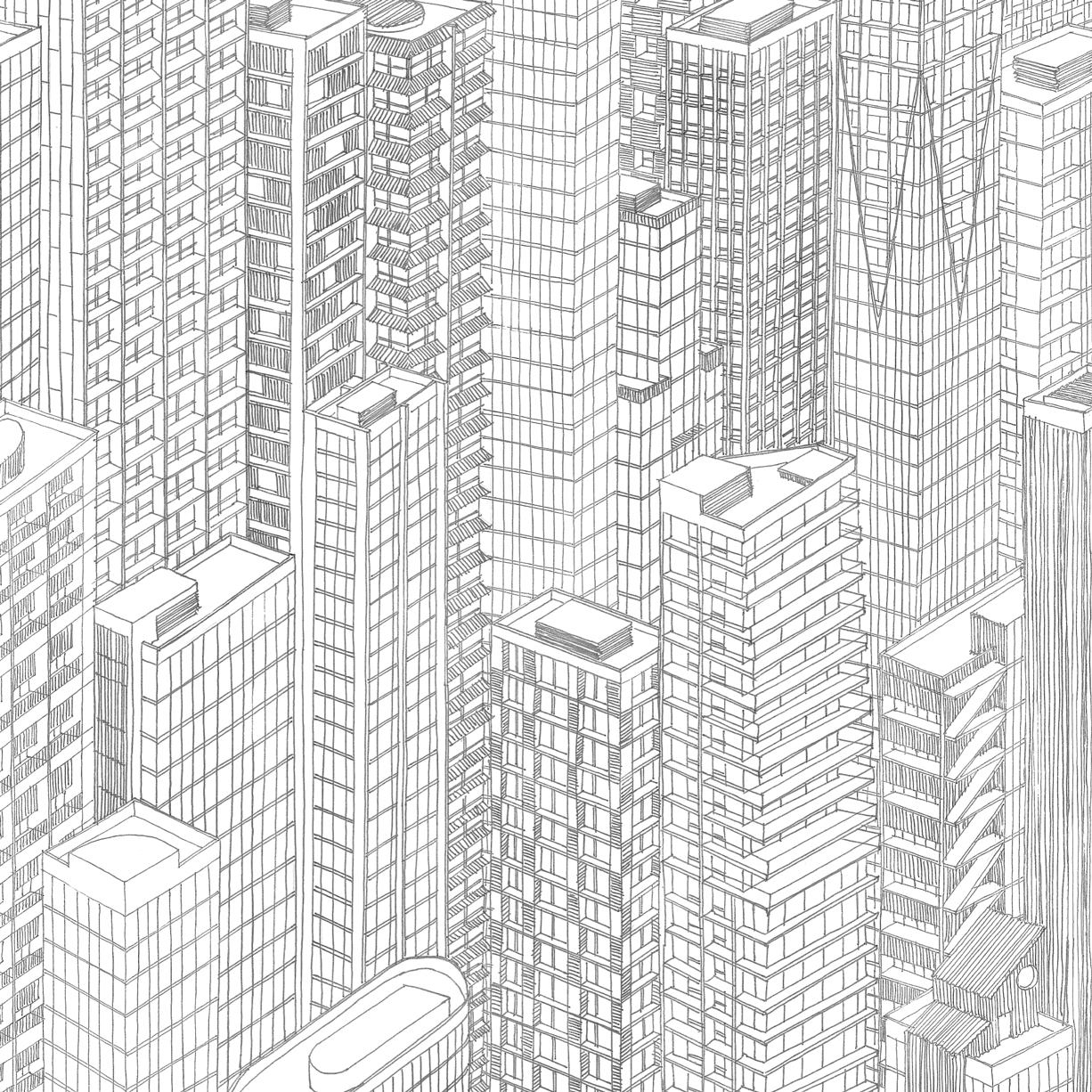 Cities that live in Daniel’s subconscious and that are reinterpreted and developed against a background of white leaves, through lines that are cast in charcoal and black pen, almost always in an absence of color.