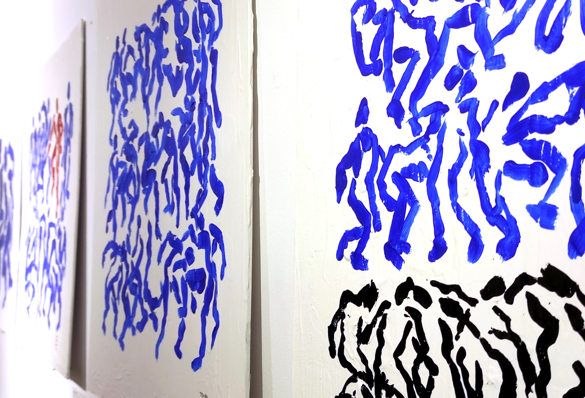 The man, the nudity and the blue constitute the language that draws a body in contrast with another, which can be the same. The dichotomy between action in relation to the neighbor and the self is vast enough to be represented. These are graphic impressions that reference the collective from a primitive formalization, which is progressively more defined and contemporary.”